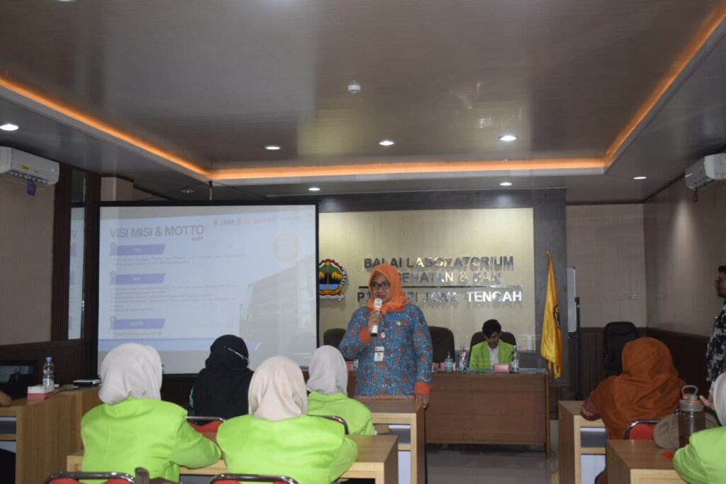 Sesi selanjutnya diisi dengan penyampaian materi oleh Ibu Atik Setyo Utami, SKM, M.Kes selaku Kasubag Tata Usaha yang memaparkan profil Balai Labkes & PAK. Setelah pemaparan materi tersebut, peserta diajak untuk melihat langsung area laboratorium pengujian, meliputi laboratorium patofisiologi, mikrobiologi, pengujian sampel makanan dan lain lain. Peserta juga berdiskusi dengan petugas mengenai prosedur kerja, serta alat dan teknologi yang digunakan dalam proses pengujian sampel.